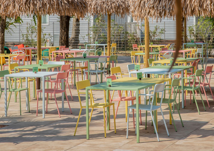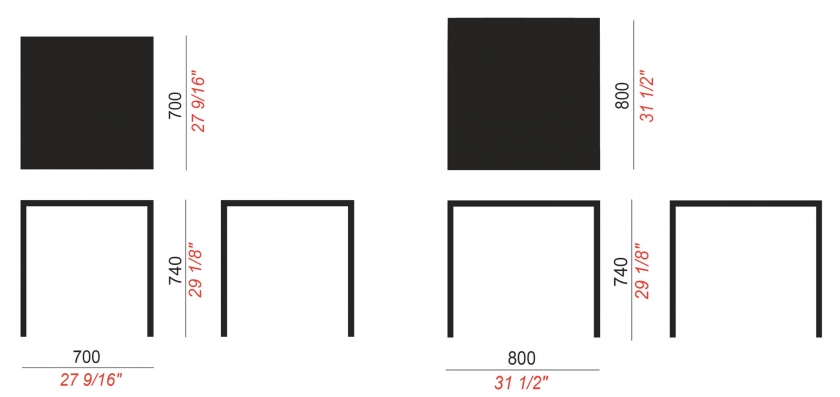 La mesa está disponible en dos variantes dimensionales (con sobre de 70 y 80 cm) y en seis colores diferentes. Se puede apilar y es muy práctica, pues se puede desplazar sin esfuerzo de ser necesario.