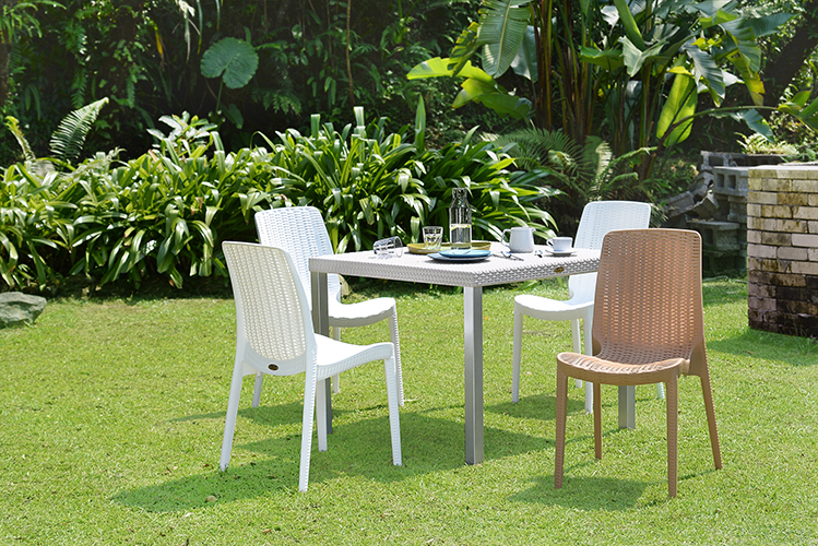 respaldo, asiento y patas: terminado en imitación mimbre de una sola pieza en polipropileno de alta resistencia y duración para intemperie, resistente a los rayos ultravioleta (UV) y al ambiente salino.