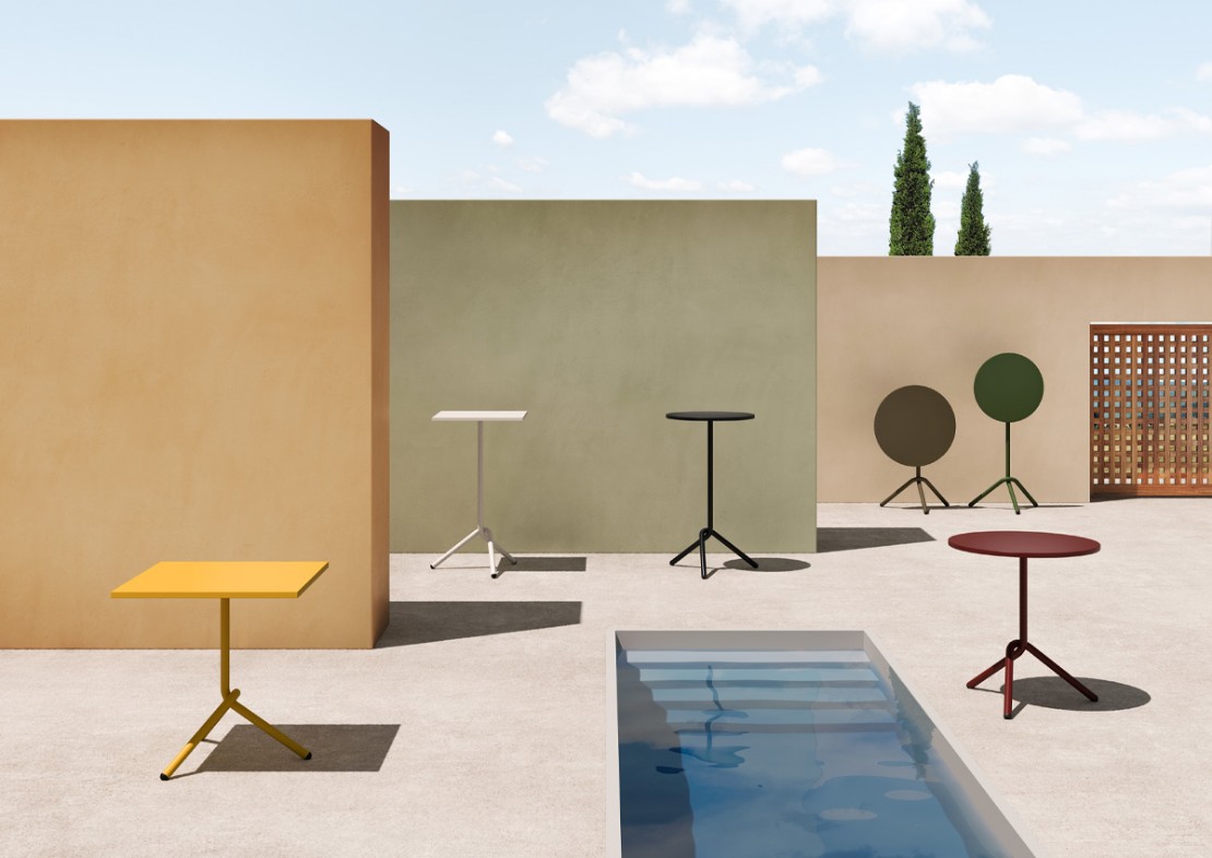 El sobre de mesa, ideal para situaciones al aire libre, está disponible en versión redonda y cuadrada, lo que permite adosar varias mesas. El tablero se puede abatir fácilmente para apilar el producto horizontalmente: de esta manera es posible utilizar el espacio de manera eficiente según sea necesario.